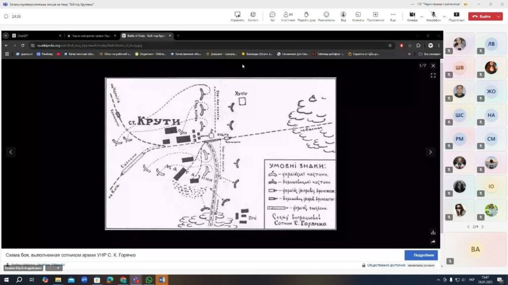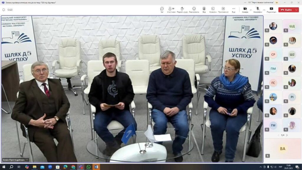29 січня – День пам’яті Героїв Крут. 29 січня – пам’ятний день в історії України. Цього дня у 1918 р. студенти та гімназисти стали на захист Києва від більшовицької навали. Наймолодшому було лише 16 років. Бій відбувся на залізничній станції Крути, за 130 кілометрів на північний схід від Києва.Пам’яті тих героїчних подій була присвячена онлайн-лекція, яка відбулася в Національному університеті «Чернігівська політехніка» 29 січня 2025 р.Організатор заходу – кафедра філософії і суспільних наук Національного університету «Чернігівська політехніка».Учасники – здобувачі вищої освіти, науково-педагогічні представники.Модератор –доцент кафедри філософії і суспільних наук Колєватов О.О.З доповіддю «Бій під Крутами» виступив Владислав Цепеш, хорунжий та голова Чернігівського осередку ГО «Центурія».Молодь була і залишається однією з рушійних сил, що наближають перемогу України як на фронті, так і в тилу.Цінуймо подвиг кожного! Вшановуймо пам’ять Героїв, загиблих під Крутами.Пам’ятаймо тих, хто віддав своє життя в боротьбі за незалежну Україну.Шануймо наших Захисників, хто сьогодні боронить Українську державу.Слава Героям! Слава Україні!
