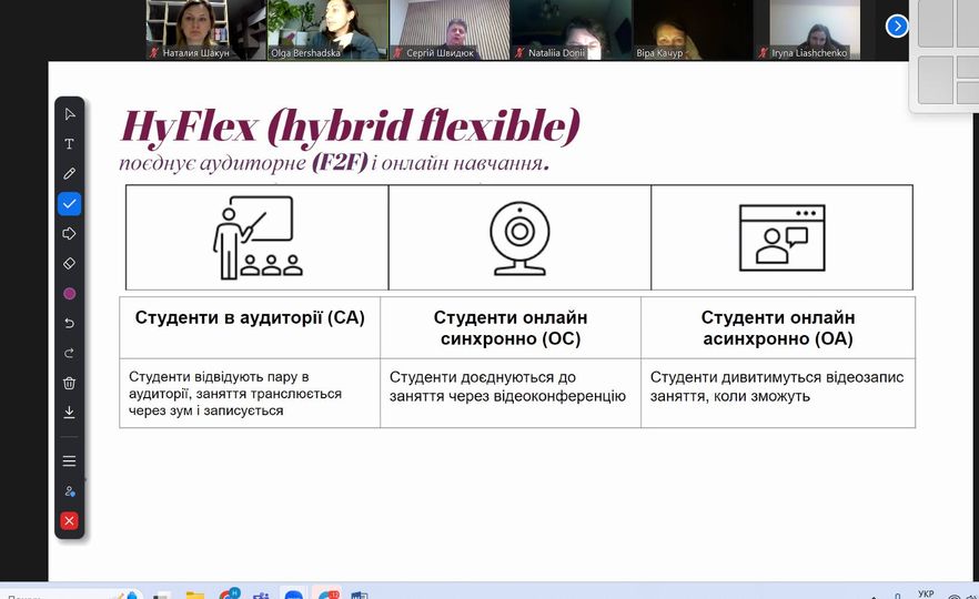 Учасники тренінгу – викладачі з Києва, Чернігова, Харкова, Дніпра, Львова та ін міст України – опановували методики гібридного навчання. Йшлося про поєднання освітніх активностей у трьох різних модальностях: наживо, в онлайні та асинхронному форматі.