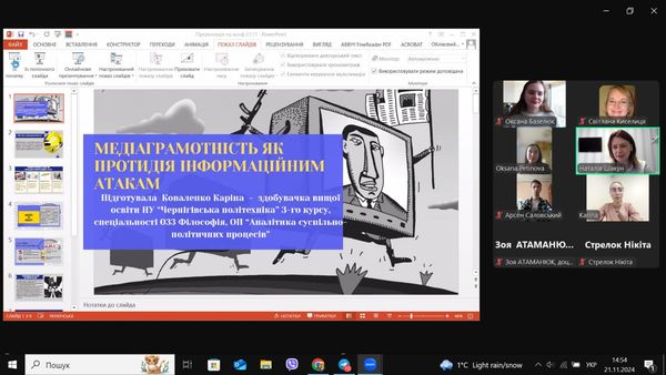 У межах цієї співпраці та з нагоди Всесвітнього дня філософії викладачі та студенти кафедри 21 листопада долучились до роботи VІІ Всеукраїнської науково-практичної конференції студентів та молодих вчених «Південноукраїнські наукові студії», яка попри численні обстріли росією Одеси та технічні виклики, відбулась у дистанційній формі 19-21 листопада 2024 року.