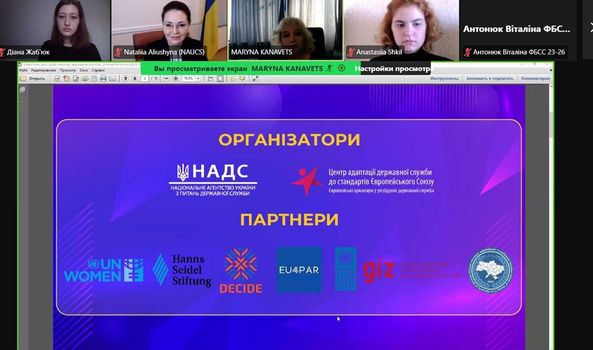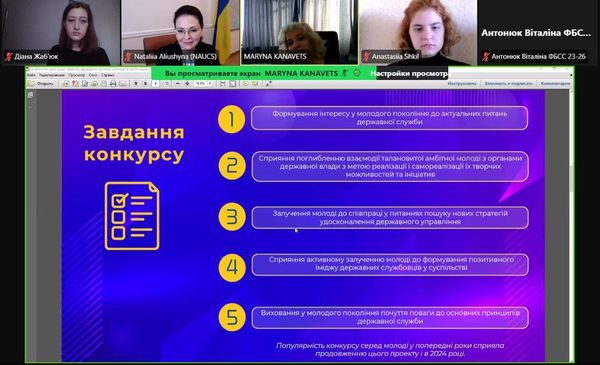 Директор Центру адаптації державної служби до стандартів Європейського Союзу Марина Канавець доєдналася до привітань учасників та презентувала цьогорічні результати залученості до Всеукраїнського конкурсу творчих робіт серед молоді.