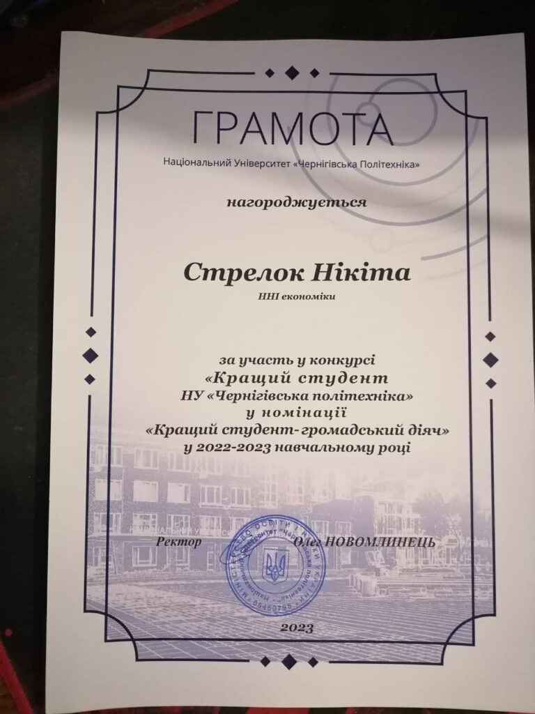 Почесною грамотою за участь у конкурсі в номінації «Кращий студент-громадський діяч» нагороджений студент ОП «Аналітика суспільно-політичних процесів» Стрелок Нікіта.